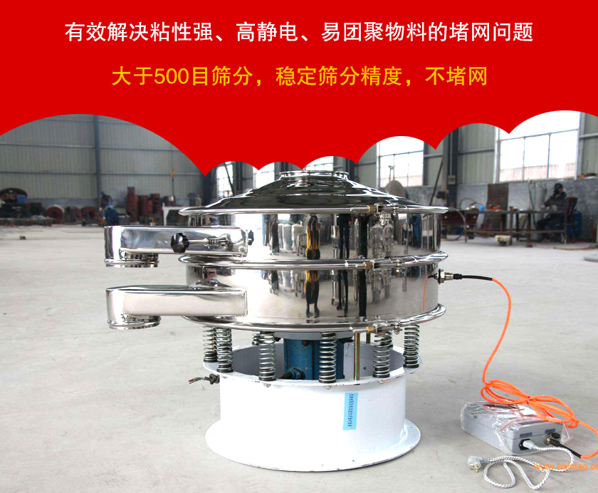 超聲波振動篩又叫超聲波振動篩分機,它是在旋振篩基礎(chǔ)上加裝了超聲波裝置,可快速分解粘附物質(zhì),超聲波振動篩適合篩分500目以內(nèi)的精細粉體,可排除物料因靜電,吸附性,易團聚產(chǎn)生堵網(wǎng)現(xiàn)象,篩分精度可提高1-70%,產(chǎn)量可提高0.5-10倍.
