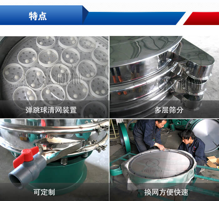 【優(yōu)勢】:①1-5層篩網(wǎng),可以同時進行2-6個粒度規(guī)格的篩分和過濾;②篩分精度可達到500目,加裝彈跳球清網(wǎng)裝置,篩孔不堵塞,篩分精度高;③可以按照用戶要求免費設計。